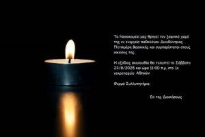 Η εξόδιος ακολουθία θα τελεστεί το Σάββατο 23/8/2025 και ώρα 11:00 π.μ. στο 1ο Νεκροταφείο Αθηνών.