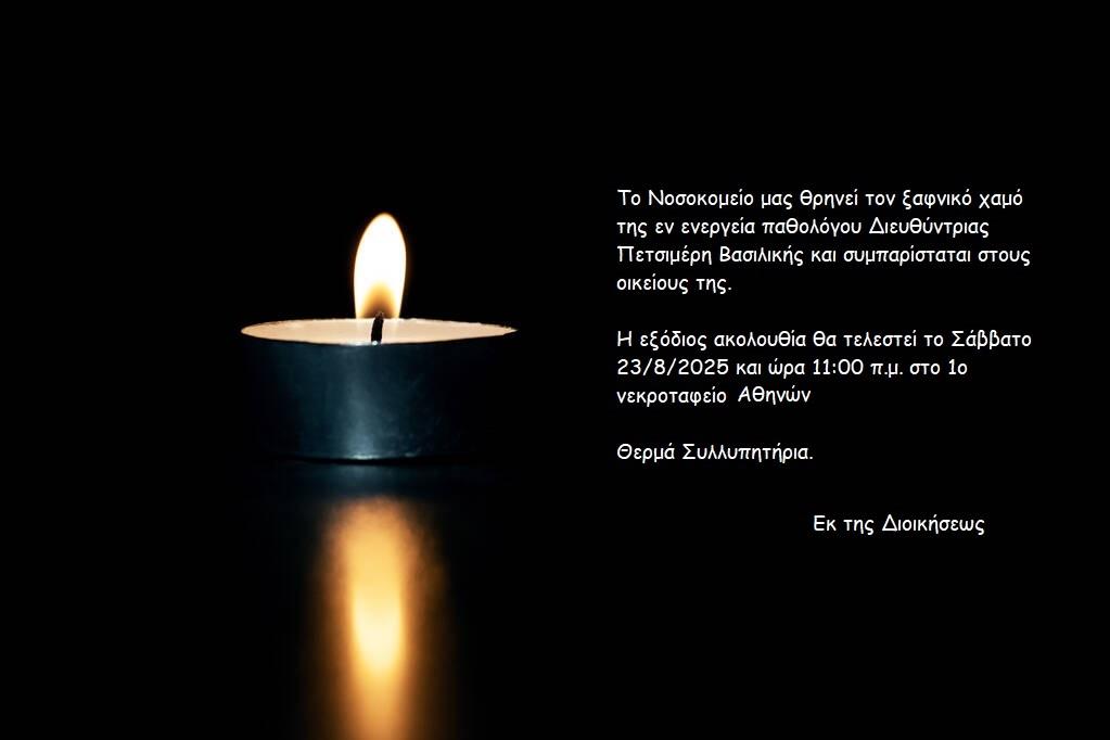 Το Νοσοκομείο μας θρηνεί τον ξαφνικό χαμό της εν ενεργεία Παθολόγου Διευθύντριας Πετσιμέρη Βασιλικής και συμπαρίσταται στους οικείους της.